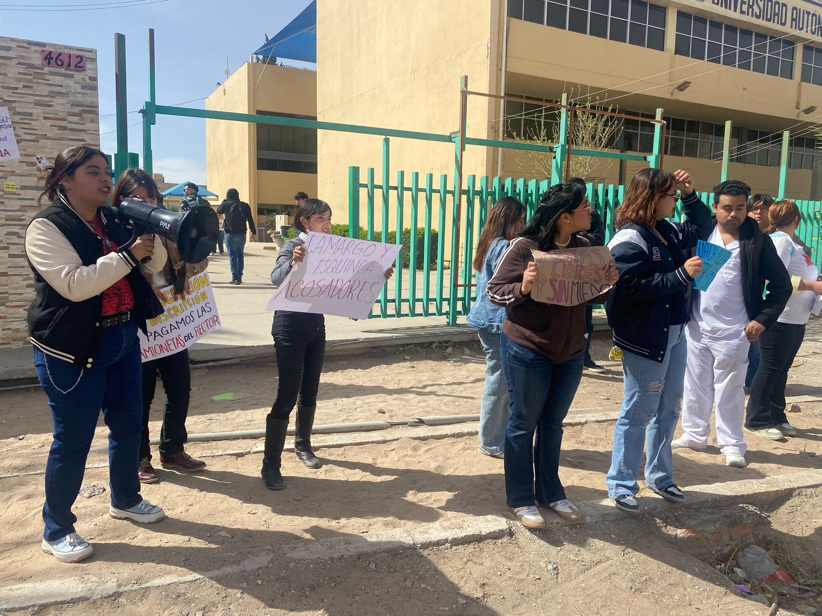 En las cartulinas de protesta se leían mensajes como: “La UACh solapa acosadores”, “La UACh no nos protege”, “Juntas libres y sin miedo”, “Exigimos profesores preparados, no retrógradas”, “No pedimos lujos, pedimos condiciones dignas” y otras en las que reclamaban por las cuotas de inscripción, desviación de recursos públicos destinados para la elaboración de un mural y señalaban a maestros presuntamente abusadores o que tienen abandonadas sus clases, a quienes identificaron como Camargo, René, Rey, Verdugo, Salcido y Casas, Chacón, entre otros.