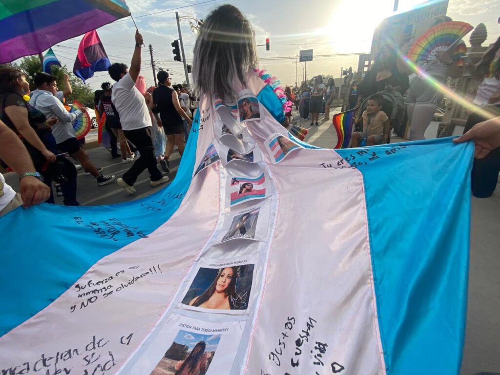 “Esta manta viene para significar por todas las hermanas trans que han sido asesinadas durante mucho tiempo. Hay que alzar la voz por ellas, la marcha no solamente es para divertirnos sino para seguir luchando por los derechos de todos, todas y todes… son 10 personas que desde 2015 a la fecha han sido asesinadas, dos de Juárez, una de ellas Tania”, dijo Ingrid.