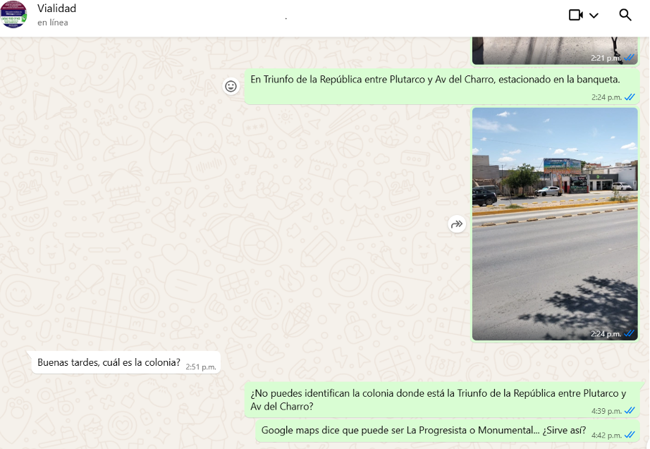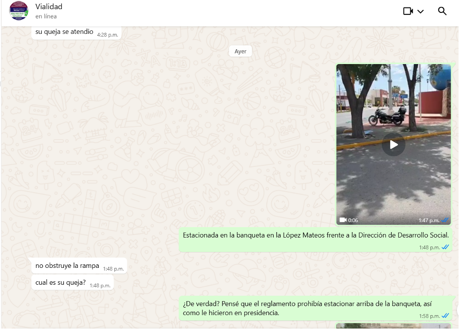 ¿Atiende las denuncias de la ciudadanía? Dice que sí, pero no hay manera de saberlo. La Dirección de Vialidad, tiene un número de WhatsApp para denunciar distintas faltas, 656 183 3143. Debemos reconocer qué no lo atienden las personas más capacitadas. Por ejemplo, no saben donde están cruces de calles principales.