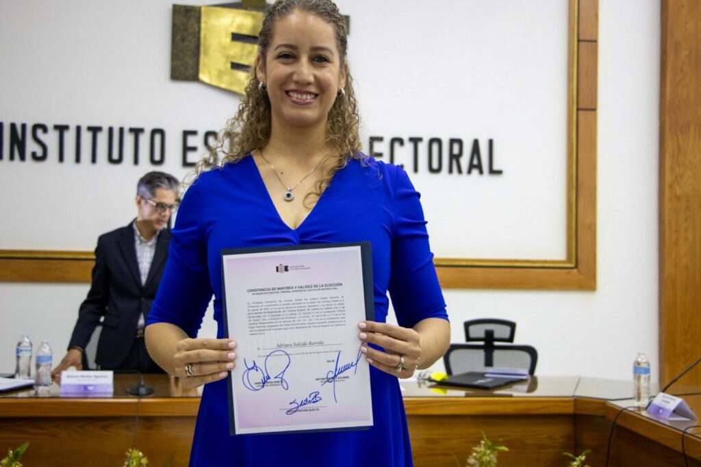La jueza de lo familiar Sara Julieta Muñoz Andrade recibió su constancia de mayoría para ocupar una magistratura del TSJ por lograr 76 mil 838 votos, con esta modificación quedó sin efecto la constancia entregada a Javier Alberto Torres Pérez, con 69 mil 913 sufragios.