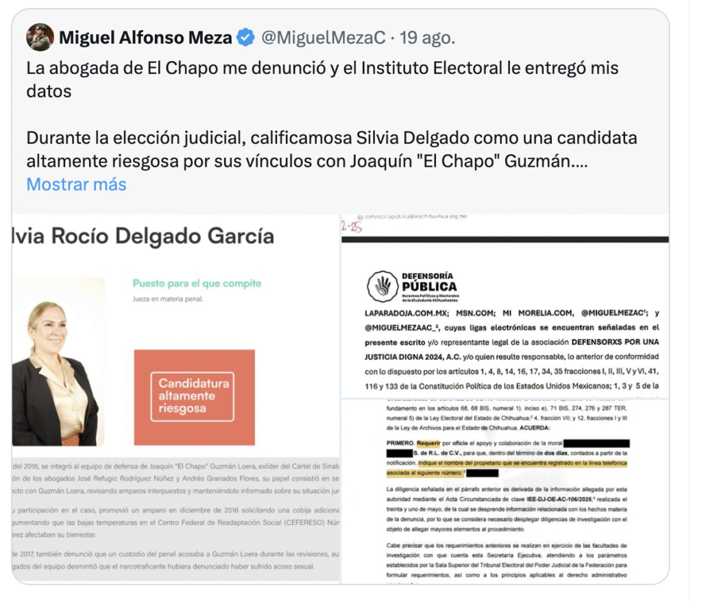 “La abogada del Chapo me denunció y el Instituto Electoral le entregó mis datos”, publicó el director de la organización Defensorxs, Miguel Alfonso Meza, en su cuenta de X este martes.