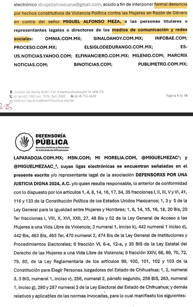 En su publicación, Meza comparte una imagen de una parte del documento de la denuncia en su contra, donde además se menciona a los medios que demandó la abogada, se trata de Omnia.com.mx, Sinaloa Hoy, Infobae, Proceso, El Siglo de Durango, Noticias Yahoo, El Financiero, Milenio, Marcrixnoticias.com, BI Noticias, Publimetro, La Paradoja, MSN noticias, Mi Morelia.com