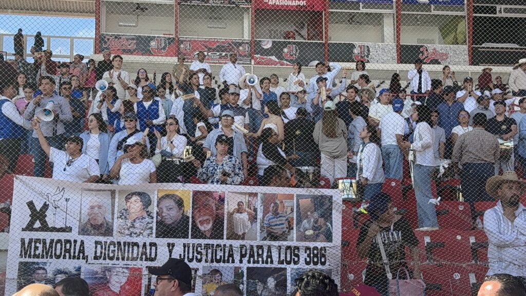 Los que lograron colarse entre la multitud fueron algunos de los deudos del Crematorio Plenitud donde se localizaron 386 cuerpos almacenados en junio pasado. Ellos llegaron con demandas de justicia y protestas contra la gobernadora por el rezago en la identificación de los cadáveres. “Maru Campos, tu gobierno no da respuesta, ¡basta! ¡386 cuerpos demandan justicia”, se leyó en una manta sostenida por integrantes del colectivo Memoria, Dignidad y Justicia. También consiguieron un lugar en las gradas los maestros y trabajadores de la SNTE, así como integrantes de los colectivos Árboles en Resistencia y el Frente en Defensa de El Chamizal, que entregaron a la presidenta una denuncia contra el alcalde Cruz Pérez Cuéllar, a quien acusan de ir contra la causa de rescate de este parque público privilegiando intereses privados.