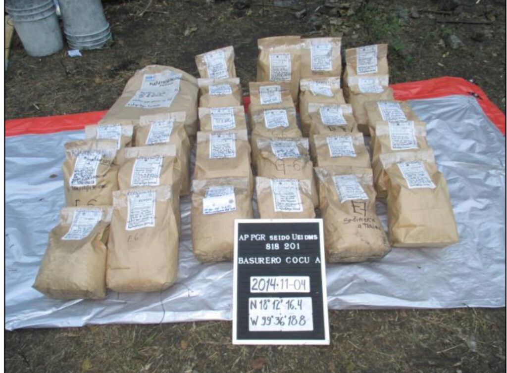 Recolección de supuestas evidencias encontradas por la FGR el 4 de noviembre de 2014 en el basurero de Cocula, donde la “verdad histórica” afirma que fueron asesinados los jóvenes. Fotografía: EAAF