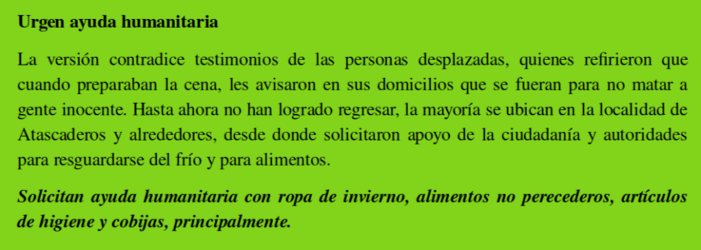 La versión oficial contrasta con testimonios de las personas desplazadas, quienes refirieron que cuando preparaban la cena, les avisaron en sus domicilios que se fueran para no matar a gente inocente. Hasta ahora no han logrado regresar, la mayoría se ubican en la localidad de Atascaderos y alrededores, desde donde solicitaron apoyo de la ciudadanía y autoridades para resguardarse del frío y para alimentos. Solicitan ayuda humanitaria con ropa de invierno, alimentos no perecederos, artículos de higiene y cobijas, principalmente