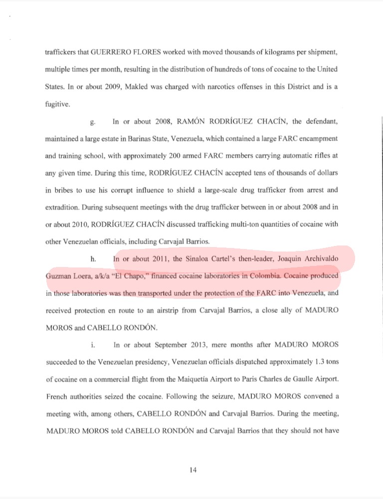 “Alrededor de 2011, el entonces líder del cartel de Sinaloa, Joaquín Archivaldo Guzmán Loera, alias ‘el Chapo’, financió laboratorios de cocaína en Colombia. La cocaína producida en esos laboratorios se transportaba luego bajo la protección de las FARC a Venezuela, y recibía protección en su trayecto hacia una pista de aterrizaje de (Hugo Armando) Carvajal Barrios (ex militar, y ex político venezolano), un aliado cercano de Maduro y Cabello Rondón”, se lee en la acusación.