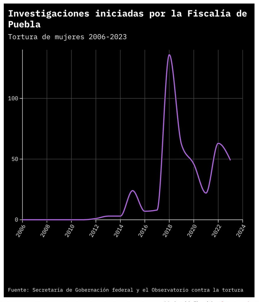 Así como Verónica fue objeto de tortura sexual para declararse culpable por dos secuestros, para esta investigación se encontraron al menos otros dos casos similares, el de Ana en 2017 y el de otra mujer a la que identificaremos como Emma, en 2020. Sus historias son una muestra mínima, si se considera que de 2006 a 2023 se abrieron 424 carpetas de investigación en Puebla por tortura de mujeres, según datos del propio Diagnóstico de la Segob (2006 a 2021) y reportes de Observatorio contra la tortura (2022 a 2023).