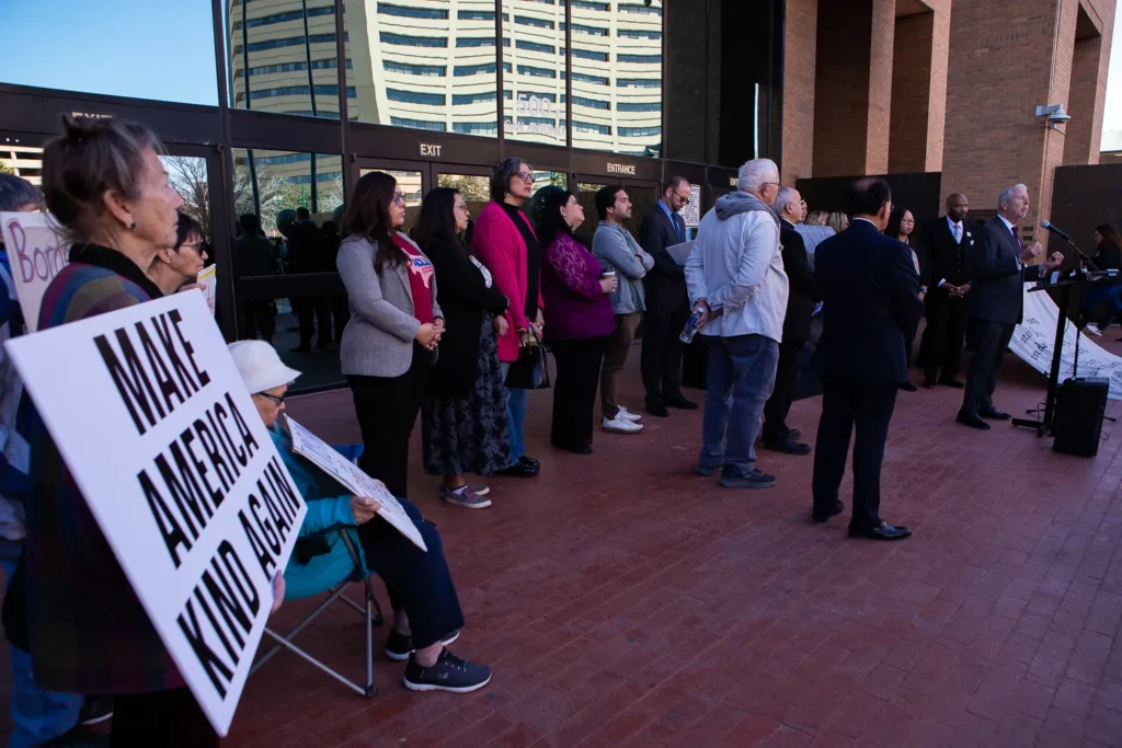 A Seitz se unieron un puñado de funcionarios electos y representantes de la Red Fronteriza para los Derechos Humanos, Casa Anunciación, El Centro de Defensa de los Inmigrantes de las Américas y Estrella del Paso, entre otros organizaciones.