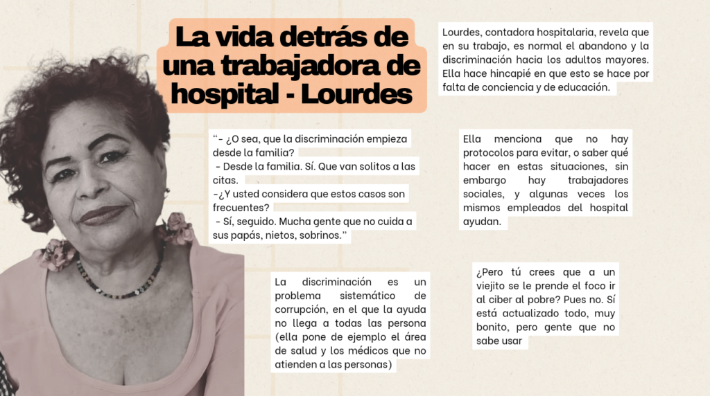 Lourdes Meza, contadora de 64 años y quien también trabaja en los servicios hospitalarios públicos, lo vive de cerca en su entorno laboral y familiar: “la discriminación comienza en casa. He visto a hijos que deciden por sus padres sin escucharlos”. En el ámbito médico, observa con dolor cómo los profesionales ignoran al paciente mayor para dirigirse únicamente a sus acompañantes: “Eso los lastima, porque sienten que ya no valen”.
