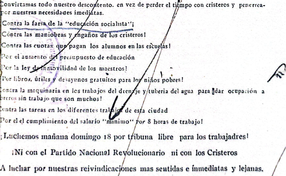 Los manifestantes consideraban una farsa lo que hacia el gobierno del PNR. Consideraban que distraía a los trabajadores de la lucha contra la miseria y el hambre que las agobiaba, y también provocaba a los cristeros, quienes a su vez aprovechaban el descontento de los trabajadores para guiarlos hacia la lucha contra el fantasma de la falsa “educación socialista”. Son los debates que dominaban. Ciertamente había una preocupación por lo que sucedía en el ámbito internacional, pero la lucha interna entre distintos frentes, absorbía a todos.