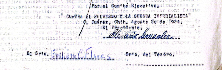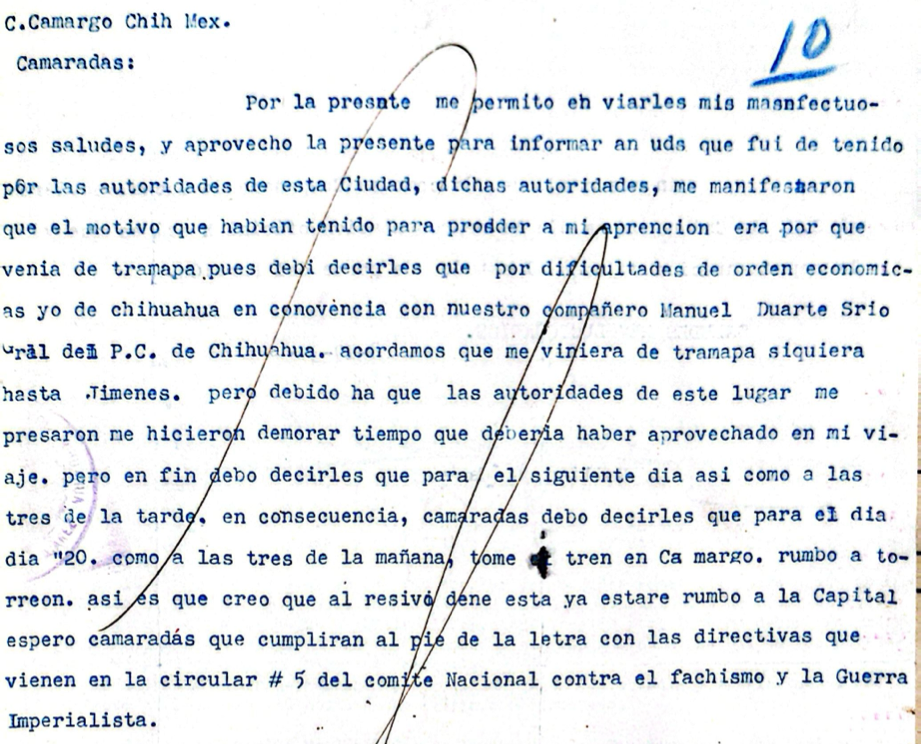 La otra parte, la de los acusados, muestra esa capacidad para oponerse al poder aun en las limitaciones de lo más elemental. Un ejemplo es cuando Emiliano Canchola Flores señala en la carta “que ni el pasaje completo” le dieron, cosa que a la postre, es lo que lo llevó a la cárcel en Camargo. Sin embargo, lo encomiable es que aun así siguió con el trabajo de organización. Llegó a la ciudad de México y estuvo en ese Primer Congreso Contra el Fachismo y la Guerra Imperialista. Por supuesto, se quedan las preguntas de qué fue a hacer, más allá de la presencia física.