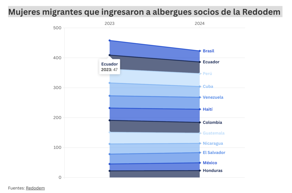 El panorama de la migración en el país revela un movimiento que se ha extendido y diversificado. Según los registros disponibles del Gobierno Federal, la mayoría de las mujeres en situación migratoria, por lo menos en el 2024, son principalmente de Sudamérica y Centroamérica, siendo países como Venezuela, Ecuador, Honduras, Colombia y Guatemala los principales lugares de origen de las personas migrantes.