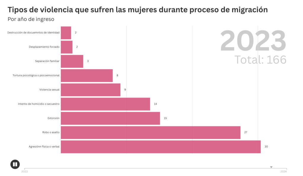 En 2024, el secuestro fue la violencia más mencionada por mujeres migrantes, con 32 casos reportados, hecho de suma importancia al no haberse documentado en 2023. La extorsión, en cambio, disminuyó notablemente en los reportes. También se registraron aumentos significativos en tortura psicológica (9.5%), violencia sexual (14.3%) y agresiones físicas o verbales (31.7%), con incrementos con respecto al año previo.