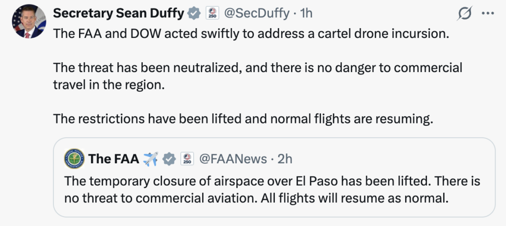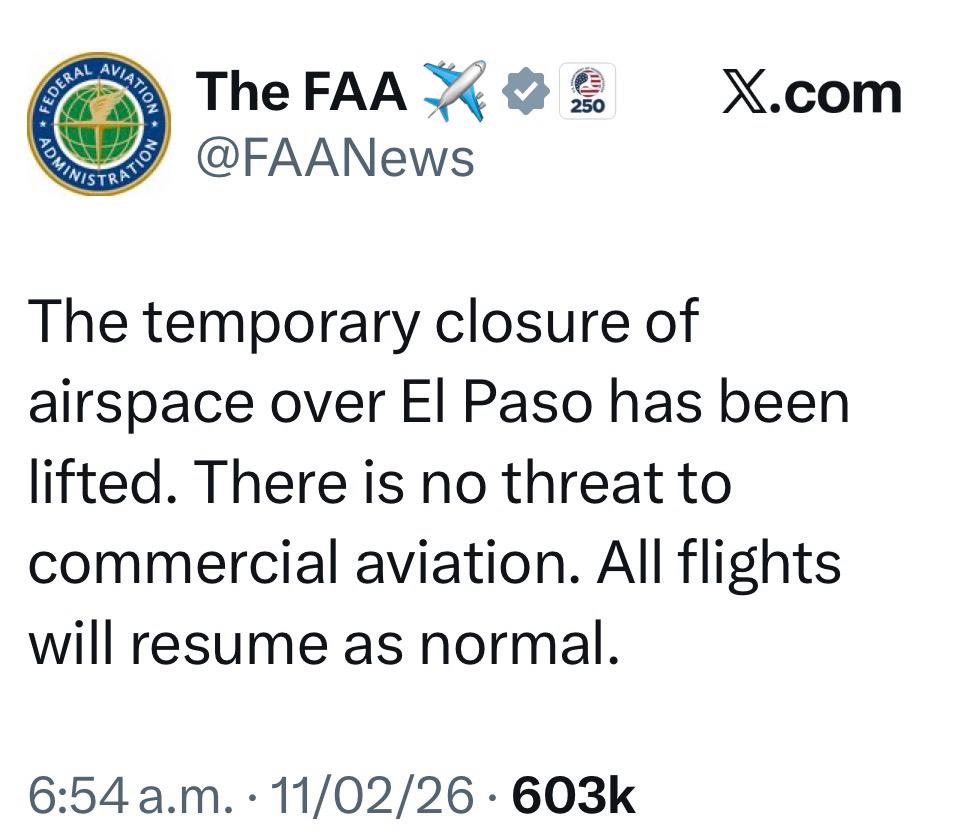 No se notificó con antelación a mi oficina, a la ciudad de El Paso ni a ninguna persona involucrada en las operaciones del aeropuerto. Hemos instado a la FAA a levantar las restricciones temporales de vuelo impuestas en el área de El Paso. Seguiré publicando la información a medida que la conozca.